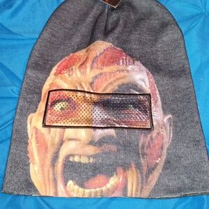 Striking red demon mask featuring a fierce graphic design. Perfect for costumes or themed events. great Halloween bundle. both items are new.