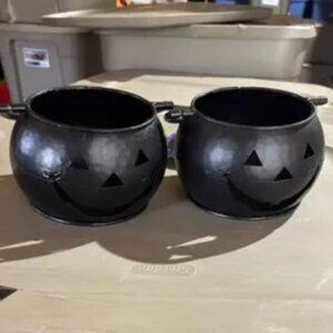 Halloween Candy Cauldron Kettles 5" Set of 2 Black Metal Pumpkins Handle