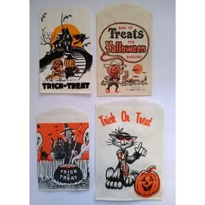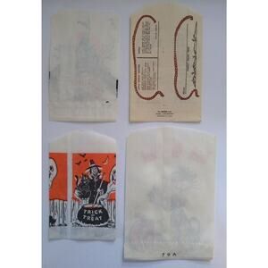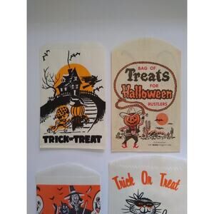 Nice set of (4) different new old stock vintage Halloween paper treat bags. Most look to date from the 1950's-1960's. Includes a hard to find anthropomorphic cowboy goblin in western attire made by Moro. They are 5.5"- 7" size. Unused condition with some wrinkles and light storage wear. Additional goodie bag sets for sale in our store. Stock #21.