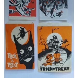 Nice set of (4) different new old stock vintage Halloween paper treat bags. Most look to date from the 1950's-1960's. They are 5.75"- 7" size. Unused condition with some wrinkles and light storage wear. Additional goodie bag sets for sale in our store. Stock #20.