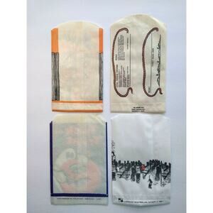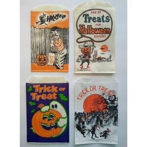 Nice set of (4) different new old stock vintage Halloween paper treat bags. Two on top are the oldest and should date back to the 1950's. They are 6."-6.5" size. Unused condition with some wrinkles and light storage wear. Additional goodie bag sets for sale in our store. Stock #11