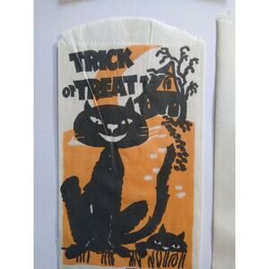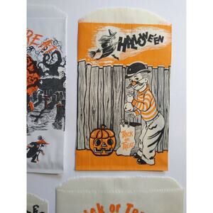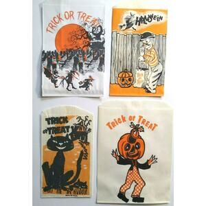 Nice set of (4) different new old stock vintage Halloween paper treat bags. Most look to date from the 1950's-1960's. They are 6."- 7" size. Unused condition with some wrinkles and light storage wear. Additional goodie bag sets for sale in our store. Stock #9