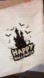 Canvas tote bag with a spooky Halloween design. Features bats and a haunted house graphic.