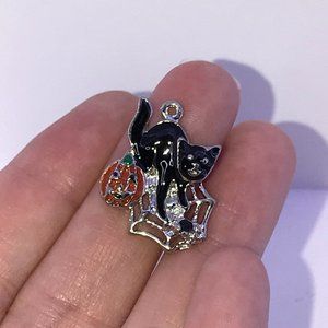 This silver-plated "pewter" (zinc-based alloy) pendant has an enamel Black cat standing on a Spider web with a Jack-O-Landern. This pendant measures 23x18mm single-sided cat with pumpkin on spider web. Super cute.