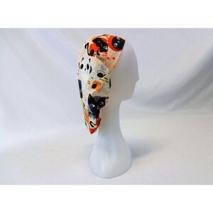 Orange bouffant style cotton scrub cap, featuring cats in Halloween costumes. Washable and reusable, so it is eco friendly.