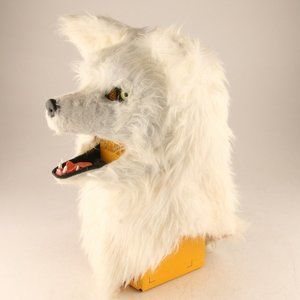 The label inside says 'Thumbs Up." There is a strap inside to hold onto head. Cool eyes. Jaw moves. No stains, damages or smells.