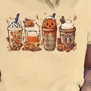 Coffee cup design with bats and pumpkins. DTF transfer sheet. This is a high-quality DTF transfer sheet that you can customize with any type of shirt, sweater, hoodie, and more. You will need a heat press to press it on your shirt.