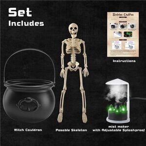Products include - 1 witch cauldron, 1 green LED fog maker, 1 splash guard, 1 skeleton.