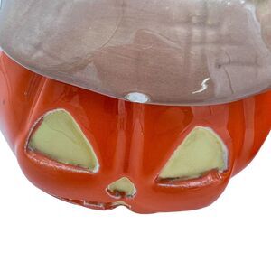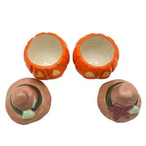 Add a touch of vintage to your Halloween decor with this Scarecrow Jack O Lantern Pair. Hand-painted with intricate details, these decorations are perfect for any room or porch. The removeable hat and small size of 5 inches make them easy to place and create a spooky atmosphere. Crafted from high-quality ceramic, these figurines are perfect for adults who want to add a unique touch to their Halloween decorations. The orange color and Halloween theme make them a great addition to any collection. Get ready to scare your guests with these one-of-a-kind decorations! Notice these pieces were signed by the artist