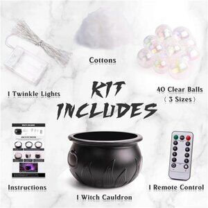 Products include - 1 witch cauldron, 1 remote control, 100g cotton filling, 40 clear balls, and a string of twinkling lights.