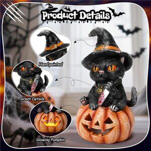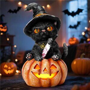 🧿Striking Hand-Painted Design: A black cat with crisp fur textures perches atop a glowing pumpkin, sporting a jaunty witch hat and clutching a tiny knife with blood-like accents. Every intricate detail is meticulously crafted to make it an eye-catching Halloween decorations indoor