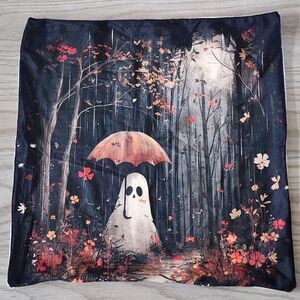 Spooky Halloween themed pillow covers featuring a Ghost in Forest holding Umbrella being rained on by Fall Leaves. Zip closure for easy use and removal. Perfect for Halloween decorators looking to add a touch of festive charm to their space. Halloween themed pillow covers Features a Ghost in Forest holding Umbrella being rained on by Fall Leaves. Zip closure for easy use and removal Ideal for Halloween decorators Adds a touch of festive charm to any space Features: Hidden Zip Closure, Soft fabric Size: 18" x 18" Condition: New Without Tags New Without Tags