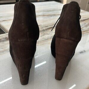 Gorgeous black suede designer booties by Diane Von Furstenberg. Size 8.5. Dramatic, high platform, lace up with brass eyelets with open see your foot lacing, peep toe. Heel 5" / platform 1-1/2". Very good condition. Spice up your Halloween vibe this season.