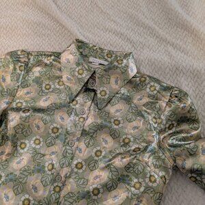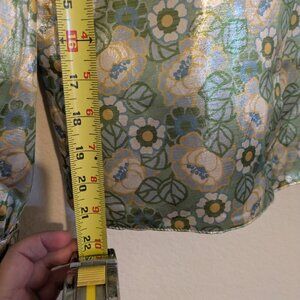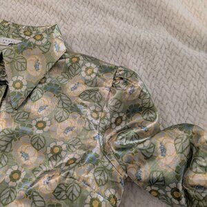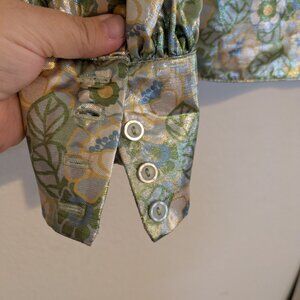The pictures can't do this justice bc the SHINE is just so epic. This super lightweight shirt has a retro floral pattern with a modern cut married to the 70s collar, placket volume sleeves and 3 button puff cuffs.
