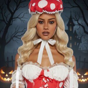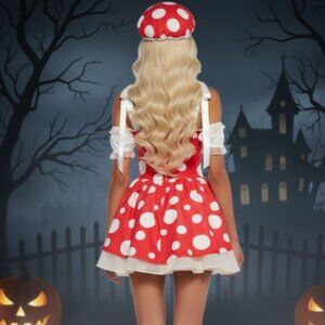 Complete Mushroom Look: This costume set includes a mini dress with an off-the-shoulder design, shoulder straps, mushroom print, and a front lace-up design, along with a mushroom hat and matching choker for a whimsical appearance.