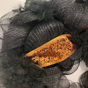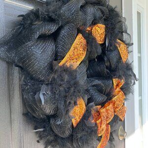 Halloween Feather Deco Mesh Wreath Black Orange Glitter Ribbon Large Big