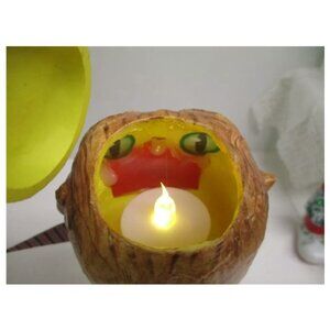 of head comes off and place a tealight to illuminate the eyes and mouth.