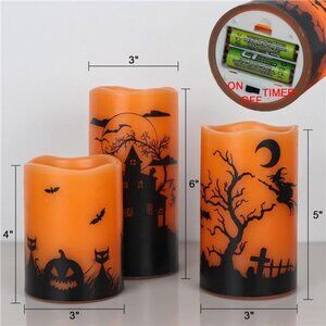 PACKAGE LIST: You will get 3 Halloween flameless candles with Bats, Castle, Witch decal, diameter 3" with 4"x 5"x 6" height, all candles are made of real wax with warm light led flickering