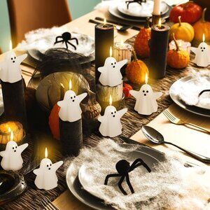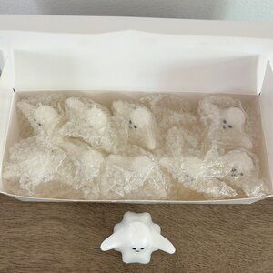 10 Piece Halloween Ghost Candles, 2.75 x 2.36 Inches. Made of soy wax. Never used but for display only. Perfect for halloween, tiered trays, tabletop or with your Rae Dunn displays. White with black eyes and mouth.