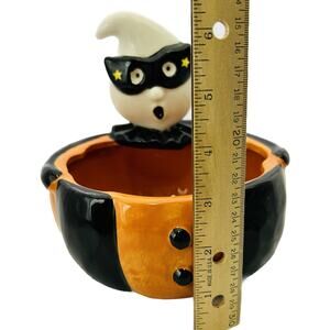 Great ceramic Halloween Masked Ghost Candy Dish. Features a cute ghost wearing a black mask and ruffled collar. Bowl is pumpkin shaped with orange and black stripes.