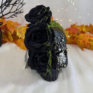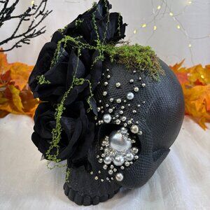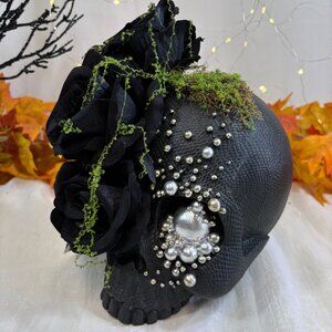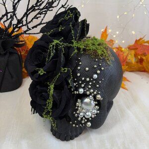 Halloween Glam Floral Black Roses Skull Pearls Moss Figure Centerpiece RARE