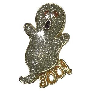 This ghost pin is a sparkling accessory that adds a touch of whimsy to any outfit. Featuring a glittery ghost with "Boo" text, it is a charming addition to Halloween-themed attire or everyday wear, offering a playful yet polished look. Secure clasp ensures it stays in place.