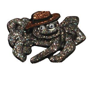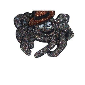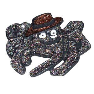 Add a touch of whimsy to attire with this glittery spider brooch. Eye-catching design with googly eyes and orange hat for unique charm.