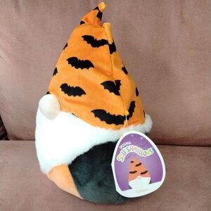 Charming gnome plush featuring an orange hat with black bat design. Perfect for Halloween decor.