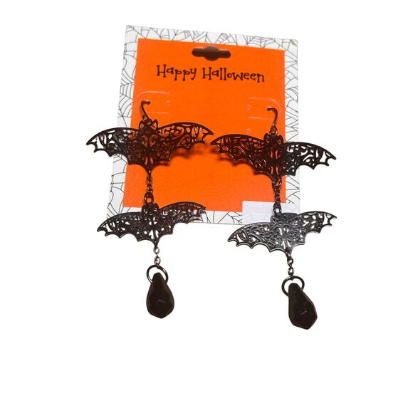 Halloween Goth Metallic Black Drop Dangle Bat Earrings Spooky Costume 3"