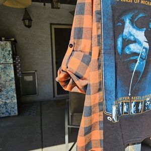 Black Halloween graphic tee featuring Michael Myers design. Paired with an orange and black plaid roll tab sleeves. Great for any Michael fans. Best suited for large and under.