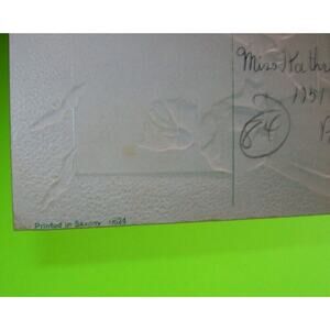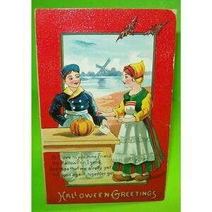 Antique vintage original Halloween postcard. Embossed graphics. Has gel coat finish with great color. Some corner and edge wear. Some soiling on back. Back side has circa 1910 cancel mark and old 1 cent postage stamp. Printed in Saxony 0624 noted on back. Stock #87.