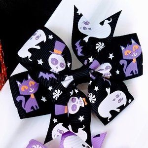 Fun and Cute Halloween Hair Bow clips Skull Ghost and Black Cat print. Two colors, to coordinate with different outfits or to share with sisters, also to coordinate mother-daughter outfits for the Halloween Season and parties. Secured with alligator clips, which will not slip easily when clipped on the hair and will not hurt when taking it off. You can also clip it in other places as decoration, such as clothes, bags, and other thin items.