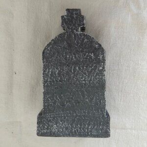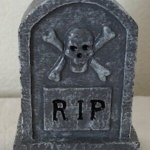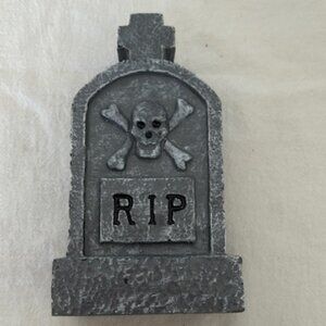 Halloween headstone wax candle -- new and unused.Raised kull and crossbones and RIP decoration on tombstone. Excellent condition. Purchased at Z Gallerie. Measures 6 inches tall, 3.5 inches wide, 2.25 inches deep. In orginal plastic wrap. I took it out to take photos and put it back in!