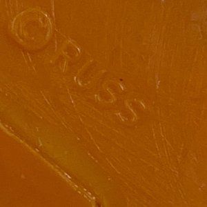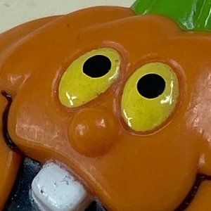 Halloween Holiday Jack-O-Lantern Pumpkin Pin Brooch Russ Silly Smile Grin One Tooth. Made of a plastic type of material, metal pin. Vintage.