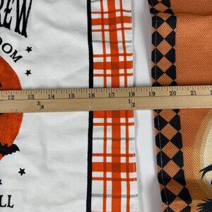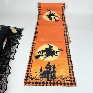 • Three table runners: one orange and black checkered with a witch motif, two spider web patterns in black and silver lace