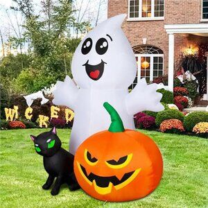 Halloween Inflatable 5FT Ghost with Black Cat and Pumpkin, Built-in LEDs Blow Up