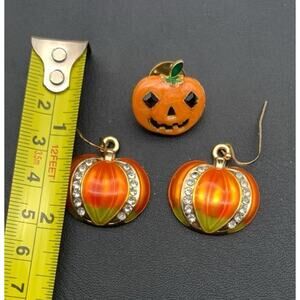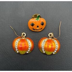 This lot includes a set of Halloween-themed jack-o-lantern/pumpkin dangle earrings and a tac pin brooch in orange color. The dangle earrings are designed in a drop style, perfect for adding a fun and festive touch to your Halloween outfit. The tac pin brooch can also be used to accessorize your clothing or bag with a cute Halloween-themed detail. Ideal for those looking to add a touch of Halloween spirit to their fashion jewelry collection.