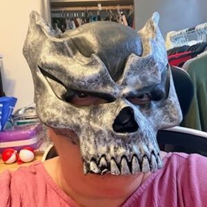 This is a vintage but great condition silvery japanes rubber Kaiju demon skull mask and matching belt. Mask cover top the entire top of head and partial back of head closely and the teeth kind of float over top of the mouth/chin area. Its comfortable to see and breath. The belt is same rubber as mask and looks like folded demon hands. This is perfect to wear mask under a cloak and tie the belt around it. I love the weathered pewter look to it. #demonskullmask #halloweenkaijumask. #japaneshalloweenmask #silverskullmask