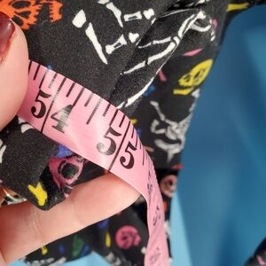 Shosho black full length pajama onesie with multi-color skeleton design, very gently used condition no issues, size XL, measurements are listed in photos