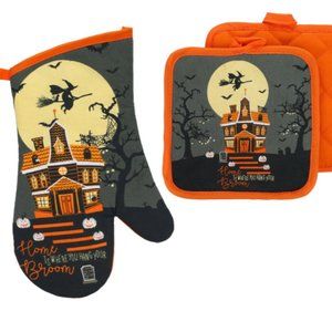Halloween Oven Mitt & Pot Holder Set HOME IS WHERE YOU HAND YOUR BROOM Quilted