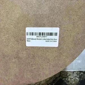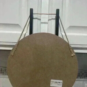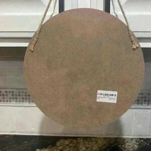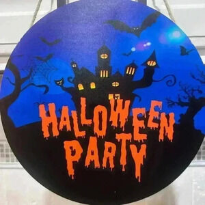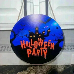 This is a Halloween party sign. It is round and made of wood. It has a blue background with a black silhouette of a haunted house, bats, and a spider web. The words "Halloween Party" are written in orange dripping letters. The sign comes with a jute rope for hanging. It is new and does not have tags or a box.