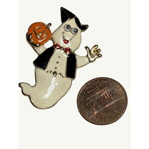 Halloween Pin Brooch Ghost Wearing Top Hat & Holding Pumpkin