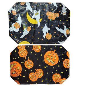 Set of 10 Halloween vinyl placemats. Five of each design. Five orange and yellow jack-o-lantern pumpkins on black background. Five ghosts, bats, moon and pumpkins on black background. Design on each side. Great for a children's party. Approximately 18" x 12". Pre-owned in excellent condition.