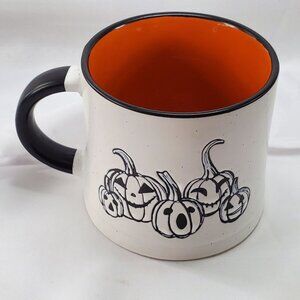 This ceramic mug, with a festive Halloween theme, showcases charming pumpkin faces on its exterior and a vibrant orange interior. The word "Boo!" adds a playful touch inside. Ideal for autumn beverages, this mug combines functionality and style, making it a seasonal favorite for those who appreciate themed drinkware.
