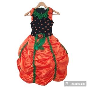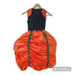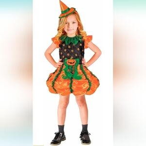 Halloween Pumpkin Witch Costume Orange Green and Black Dress with Mini Hat.