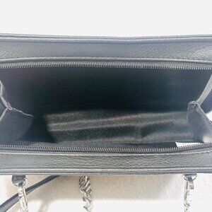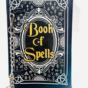 "Book of Spells" purse/Halloween accessory. Faux leather with a silver tone chain strap. Strap attaches on the back of the bag, see last photo. Inside is very clean. Size is approx. 9" X 6". Strap length is approx. 49.5" with a 24" drop. The strap is removable. Closes with a zipper. One compartment that is very clean. By Spirit.