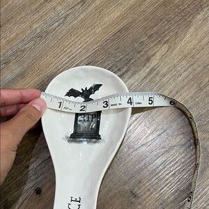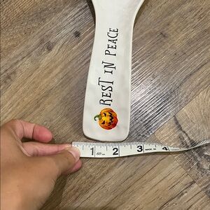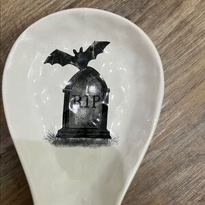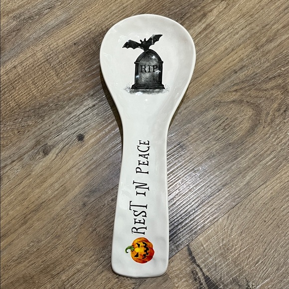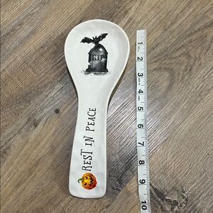 Ceramic spoon rest with 'Rest in Peace' design. Features a tombstone and pumpkin graphic. Perfect for Halloween decor.