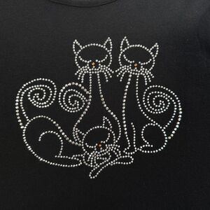 Features a sparkling rhinestone graphic of three stylized cats on the front