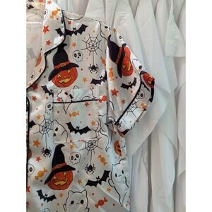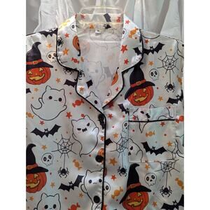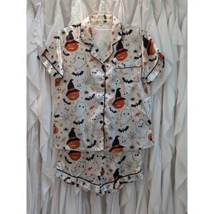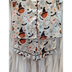 Halloween Satin Short Sleeve & Shorts PJ Set White w/Ghost,Pumpkin,Bats Medium