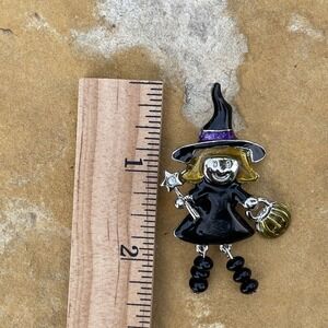 Halloween Silver Tone Enamel Witch Brooch Pin Articulated Legs Jack-O-Lantern